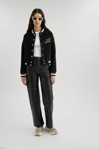 Het Off Court bomberjack is gemaakt van wol en sluit met gepolijste zilveren drukknopen. Het leent van klassieke varsity-stijlen, heeft gestreepte geribbelde boorden en is geappliqueerd met een badstof A-patch in een scriptachtig lettertype. Materiaal: Samenstelling: Buitenkant: 100% wol Voering: 100% polyester Productstijl-ID: A0466001