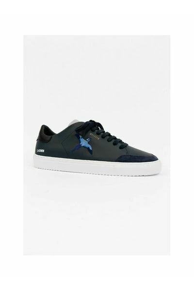 Marineblauwe Axel Arigato Clean 90 Bee Bird lage sneakers met verhoogd borduursel van de Bee Eater bird. Handgemaakt, gemaakt van glad leer met contrasterende hielkap en suède kapteendetail. Contrasterende witte tong. Witte rubberen zool met dempend voetbed en ondersteuning van de voetboog voor comfort. Versierd met goudkleurig logo aan de zijkant.