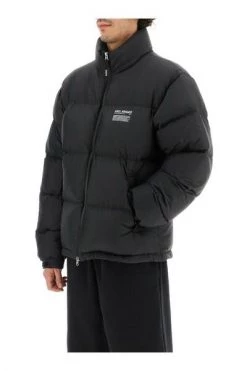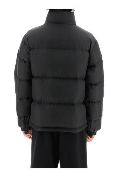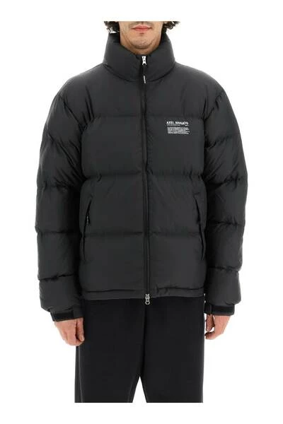 Korte oversized pufferjack door Axel arigato gemaakt in lichtgewicht technische stof verkregen uit gerecyclede polyestervezels, boudin gewatteerd en opgevuld in eend naar beneden en veer. Het beschikt over standaardkraag, ritssluiting, verstelbare manchetten en zoom en zijkapperzakken met zijkapjes. Verrijkt door contrast letters print detail op de borst. Gevoerd, met één binnenzak. Het model is 187 cm lang en draagt ​​een maat L.