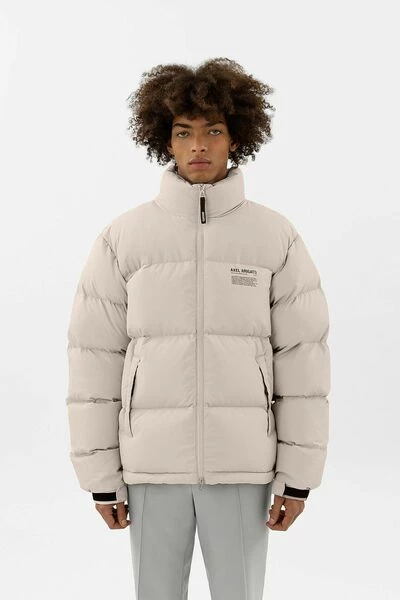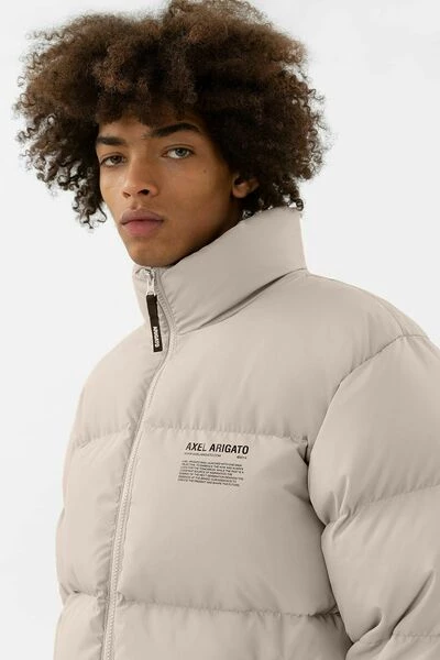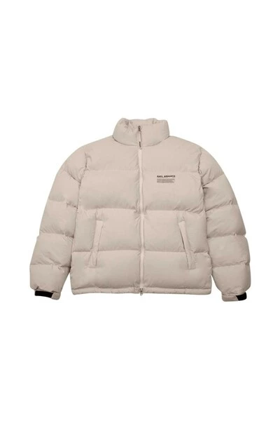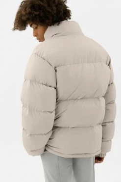 Pufferjack van lichtgewicht gerecycled polyester. Het is gewatteerd om de hergebruikte dons en veren gelijkmatig te verdelen. Het heeft een opstaande kraag en verstelbare manchetten met klittenbandsluiting om de warmte vast te houden. Deze jas is ontworpen om in de stad te dragen, dus hij is niet waterdicht maar slechts licht waterafstotend.