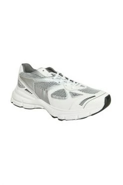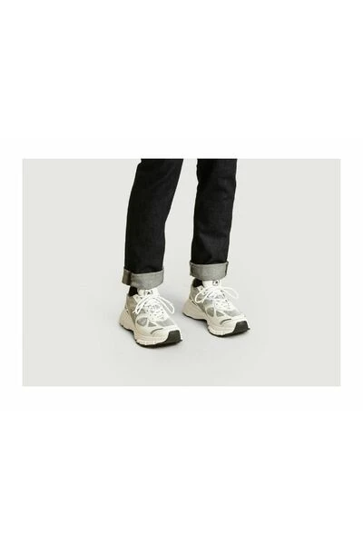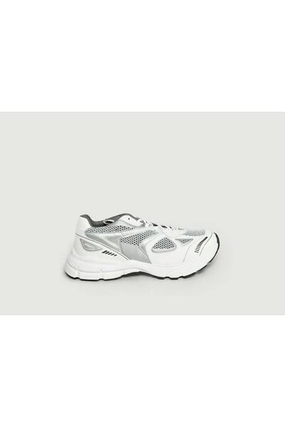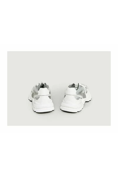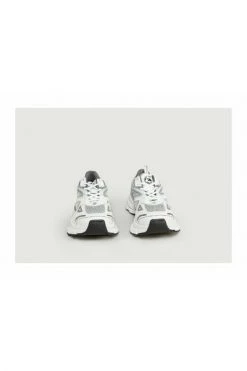 Sneakers van wit leer en grijs mesh, contrasterende witte zool (3,5 cm), reflecterende details.