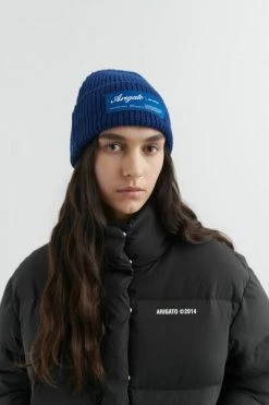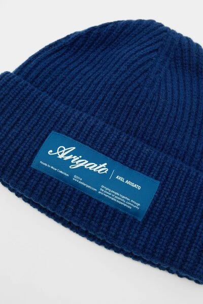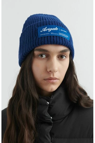De belangrijkste beanie is rib-breit van een zachte, verwarmende wollen mix. Het heeft een verstelbare gevouwen manchet die is gedetailleerd met een handgestikte logo-patch.