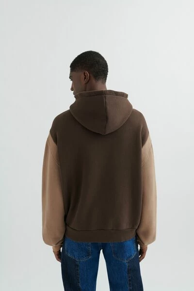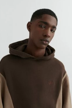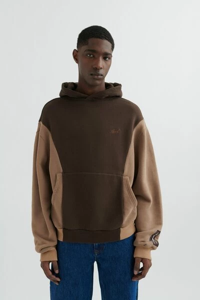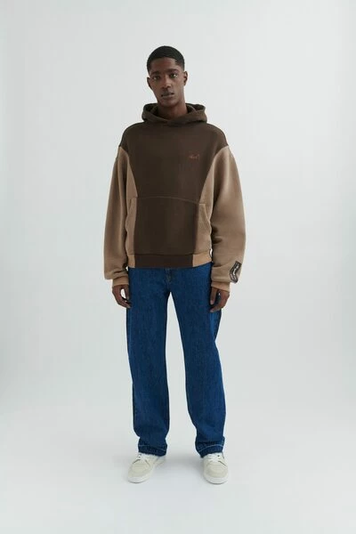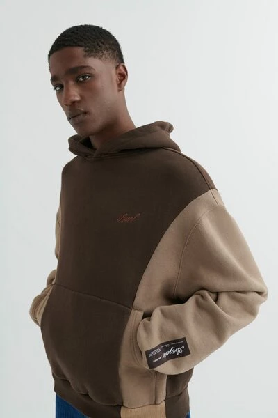 De dubbele hoodie is gemaakt van panelen van GOTS-gecertificeerd organisch katoen, waardoor een tweekleurig effect ontstaat. Het is ontworpen in een losse, ontspannen pasvorm en beschikt over logo -borduurwerk aan de borst en een discrete pleister boven de manchet. Deze hoodie wordt in een extra grote pasvorm gesneden.