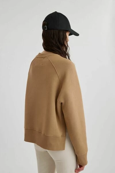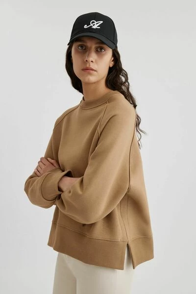 Het Rio Slit Sweatshirt presenteert een nieuw vrouwelijk ontwerp voor de collectie sweatshirts. Het iets boxy silhouet heeft splitten in de zijnaad en een asymmetrische snit aan de voor- en achterkant. De monochrome stijl is gedetailleerd met raglanmouwen en een verwijderbare A-speld met opschrift. Eugenia is 179 cm / 59 ft en draagt maat S.