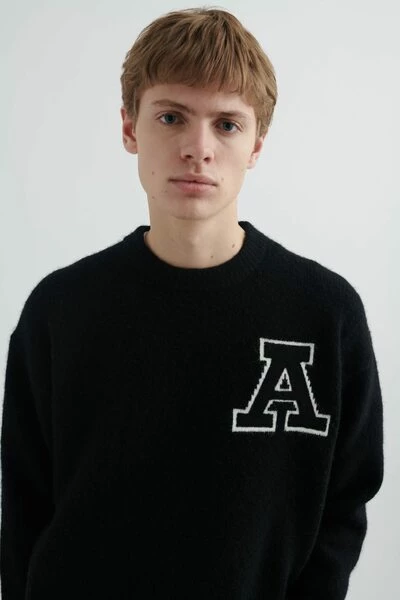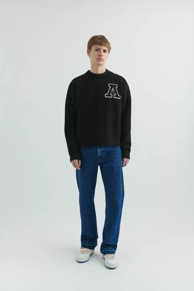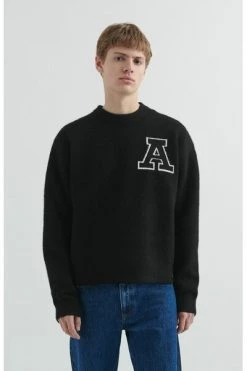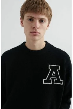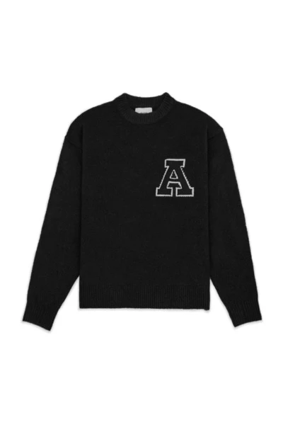 De teamtrui is gebouwd met gekookte wol, waardoor een compacte structuur aan het kledingstuk wordt toegevoegd. De trui wordt gedetailleerd met een varsity “A” met contrasterende Intarsia -contouren en een klassieke Filted Wool Needle Punch -inzet Draagt een maat M.