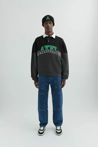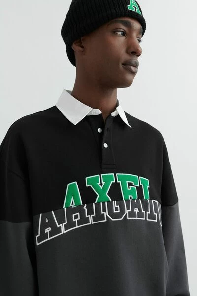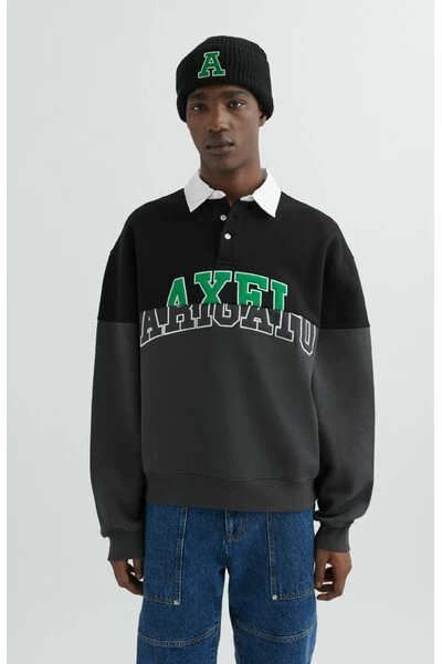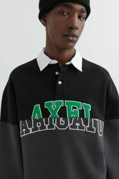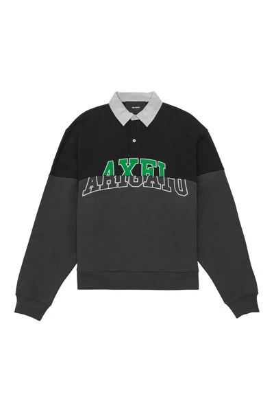 Het Unify Sweatshirt is gemodelleerd naar klassieke rugbypolo`s en heeft een contrasterende kraag- en knoopplacket. Het is gemaakt van twee panelen van GOTS-gecertificeerd organisch katoen-de ene leest `Axel` en de andere `Arigato`-ongelijk samengevoegd om een vervormd logo te maken. ft en draagt een maat M.