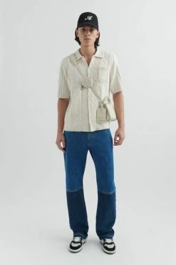 Het sonische shirt is gebreid van een katoenen mix met behulp van een combinatie van steken die variëren in grootte en textuur. Het heeft een button-down-profiel met kraag en wordt gedetailleerd op de borstzak met een ‘arigato’ pin. Dit shirt wordt regelmatig gesneden.