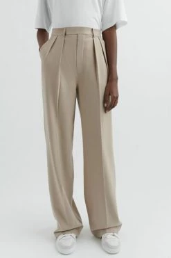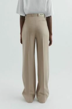 De geweven jackie -broek zijn op maat gemaakt met dubbele plooien bij de tailleband om ruimte in het profiel te creëren en de geperste vouwen netjes te houden. Ze zijn minimaal gedetailleerd met een verborgen bevestiging, riemlussen en discrete merkpatch. Deze mid-rise broek wordt gesneden in een ontspannen rechte pootfit. Jennifer is 176 cm/ 5 8 ft en draagt een maat 36.