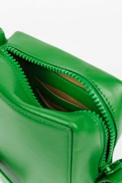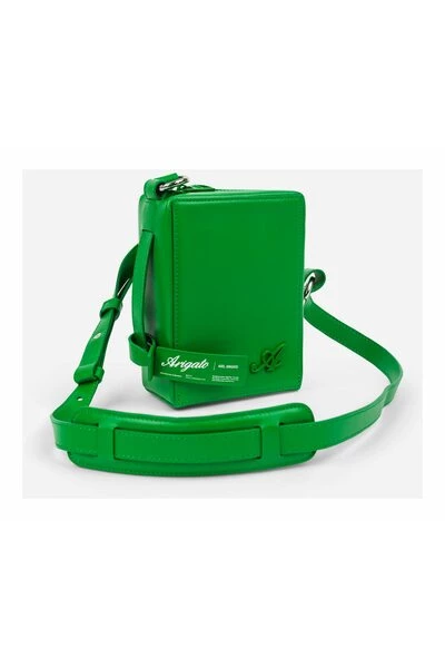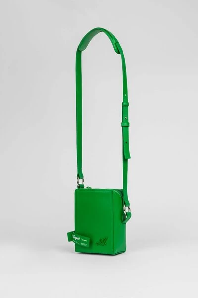 Het kubieke zak heeft een gestructureerd, hoekprofiel gemaakt van leer. Het is gedetailleerd met een lusriem die in de hand of rond de pols kan worden gehouden. Ons kenmerkende laboratorium voor merkbanden maakt dit stuk af.
