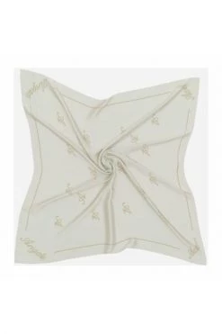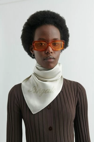 De kenmerkende sjaal wordt uit vloeibare zijde gesneden. Het is gedrukt met Axel Arigato en gestreepte randen in tonale tinten voor een subtiele afwerking.