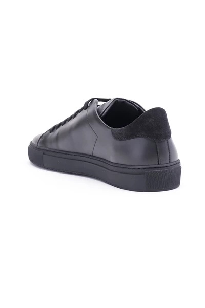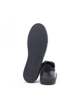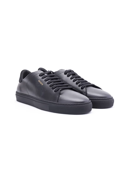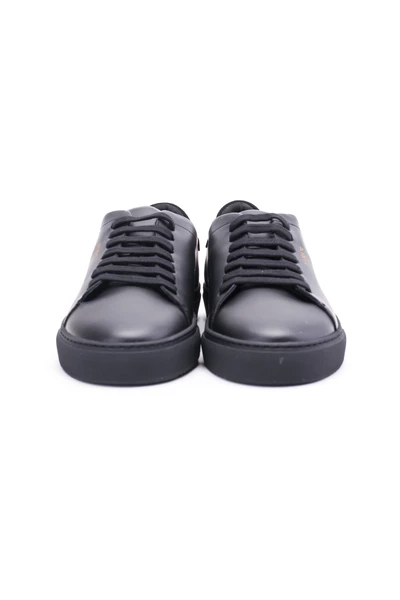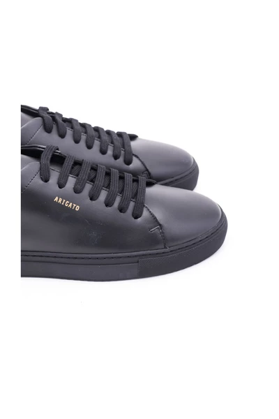 Axel arigato sneakers zwarte axel arigato sneaker met zwart lederen bovenste, zijkant gouden logo gravure en patch op hiel met contrasterend materiaal, de rubberen zool meet 3 cm.