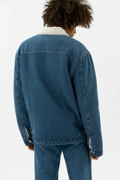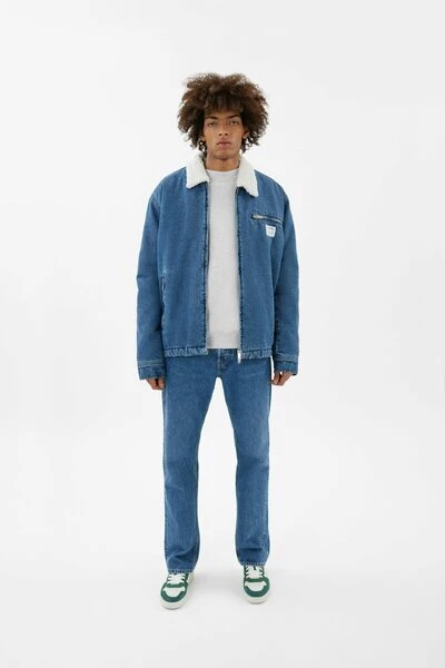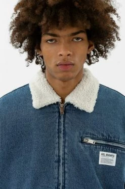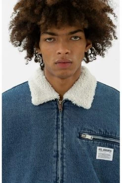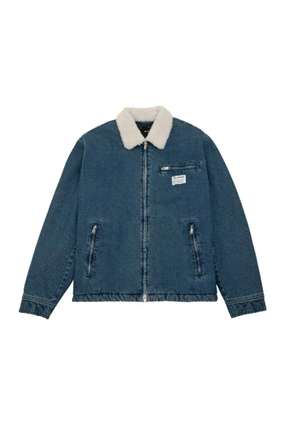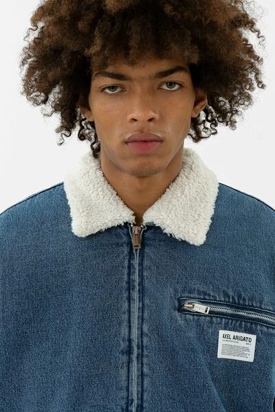 Het op de bemanning gevlekte spijkerjas is vervaardigd met behulp van een duurzame zware denimstof met een enigszins afgewassen uiterlijk. De jas is uitgerust met een comfortabele paalkraag en beschikt over details van een merkgeweven borstetiket en zilveren metaalbekleding. Omari is 183 cm / 6 ft en draagt een maat M.