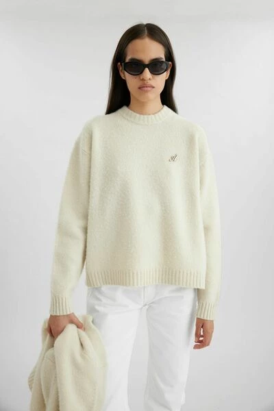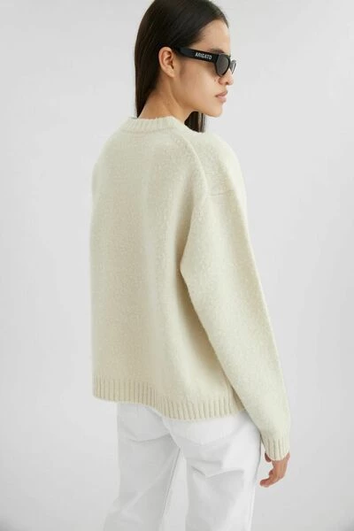 De Beyond Sweater heeft een tijdloos design gemaakt van een mix van merinowol en kasjmier. De trui is ontworpen met een decoratief pillingeffect en gedetailleerd met een verwijderbare A-speld met schrift. Laura is 180 cm / 59 ft en draagt maat S.