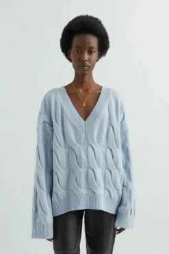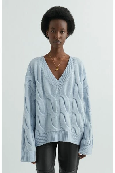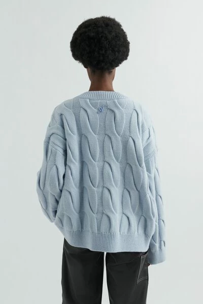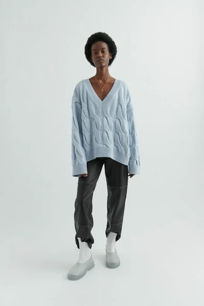 Gemaakt van een mix van merinowol en gerecycled nylon, de Carla-trui beschikt over extra grote kabels geïnspireerd op handbreidingtechnieken. Verdomd om een uniek tweekleurig effect te creëren, wordt het geribbeld bij de V-halslijn, manchetten en zoom om de ontspannen vorm een vleugje definitie te geven en is afgewerkt met een handtekening een pin. Deze trui is gesneden in een oversized fit. Jennifer is 176 cm/ 5 8 ft en draagt een maat S.