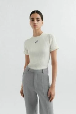 Het Honor T-shirt heeft een gebreide constructie die verticaal geribbeld is. Ontworpen voor een nauwe pasvorm met gevouwen manchetten, heeft het een klassiek silhouet voor bemanningsleden dat is geborduurd met de letter ‘A’ in contrasterende draden. Dit t-shirt is in een slanke pasvorm gesneden.