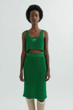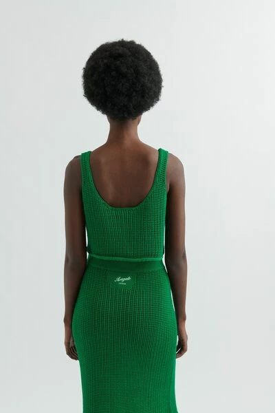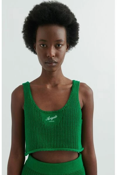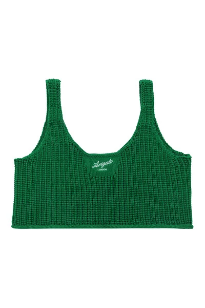 De top van de rooster is gebreid van zacht katoen in een bijgesneden silhouet. Het is ontworpen met slanke schouderbanden en heeft een subtiel gerolde zoom. Contrasterende ‘arigato’ borduurwerk dit stuk. Jennifer is 176 cm/ 5 8 ft en draagt een maat S.