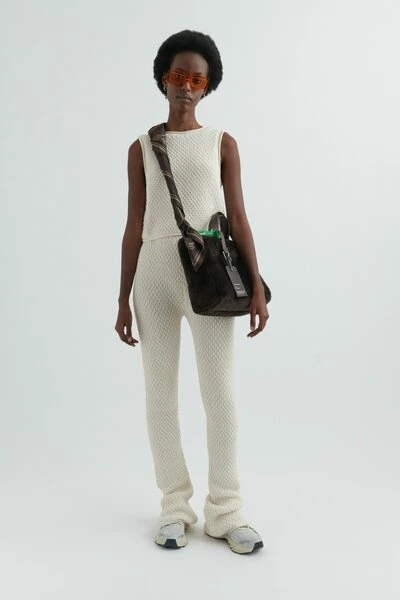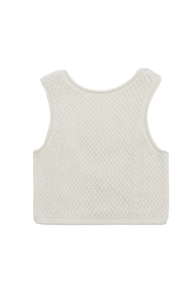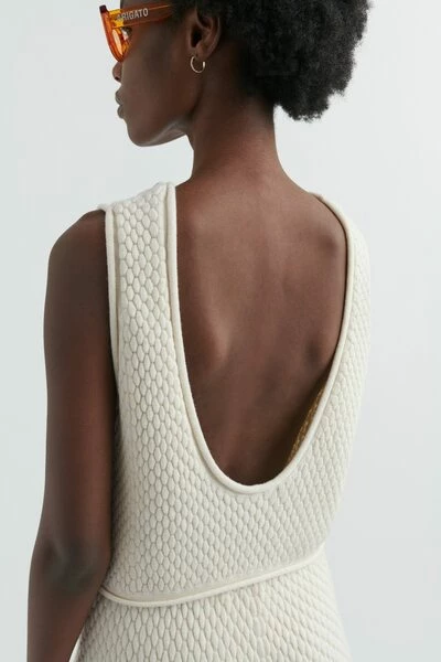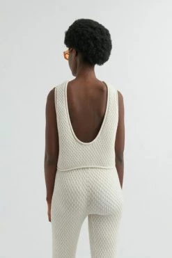 De getextureerde sense tanktop bevat taak van extra fijne merinowol en alpaca die het het zachtste handvat geven. Dit stuk heeft een bijgesneden dicht passend silhouet dat is afgewerkt met opgerolde randen. Deze bovenkant wordt regelmatig gesneden.