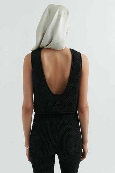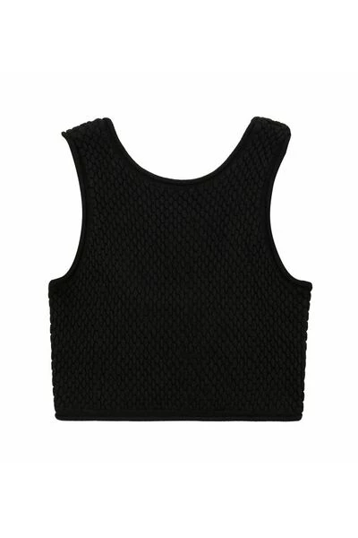 De getextureerde sense tanktop bevat taak van extra fijne merinowol en alpaca die het het zachtste handvat geven. Dit stuk heeft een bijgesneden dicht passend silhouet dat is afgewerkt met opgerolde randen. Deze bovenkant wordt regelmatig gesneden.