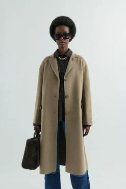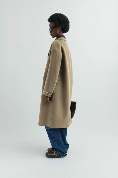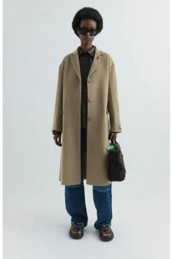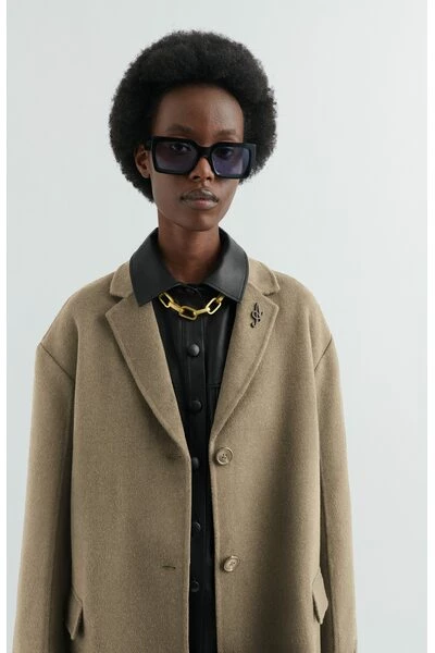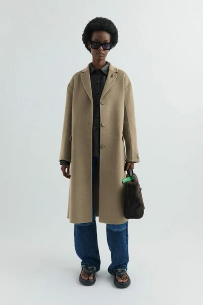 Dit seizoen presenteren we een nieuwe diepte aan het bovenkledingassortiment met een reeks nieuwe silhouetten, waaronder de dageraadwoljas. De jas is gemaakt in 100% wol met details van hoornimitatie knoppen aan de voorkant, klepzakken en een verwijderbaar script “A” Pin.Jennifer is 176 cm/ 5 8 ft en draagt een maat S.