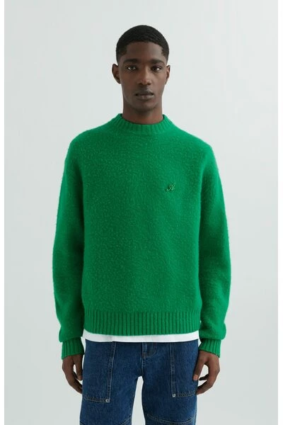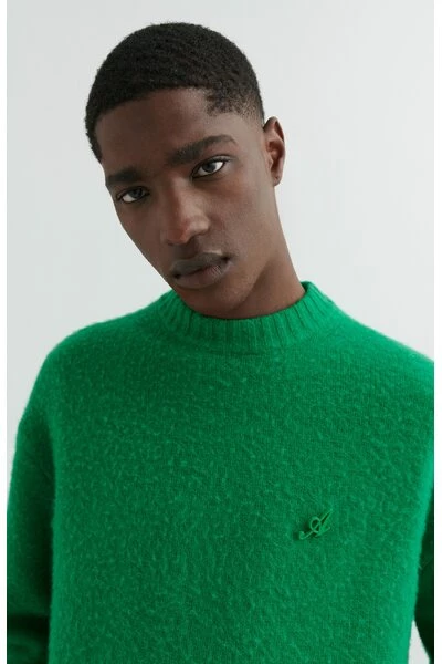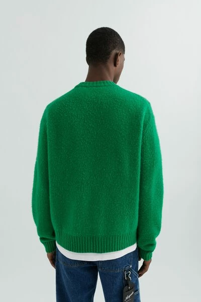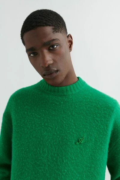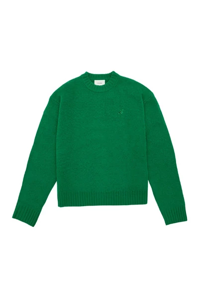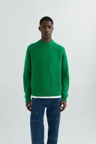 De Beyond Sweater is gebreid van een merinowol en kasjermijnmengsel met een gestructureerde handvat. Het is ontworpen in een bemanningshekprofiel met geribbelde randen en heeft een handtekening een pin op de borst. Deze trui wordt regelmatig gesneden.