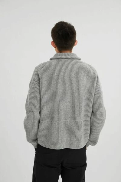 De Team-sweater is gebreid van een zachte lamswolmix en heeft een grote A-patch van badstof op de borst. Het heeft een los, ontspannen profiel met een kraag met halve rits en verlaagde schouders. Niek is 188 cm / 62 ft en draagt maat M.