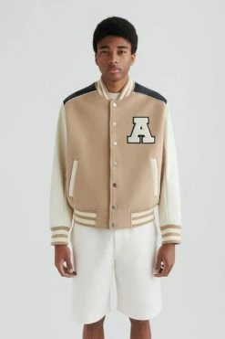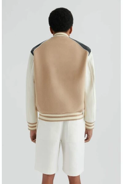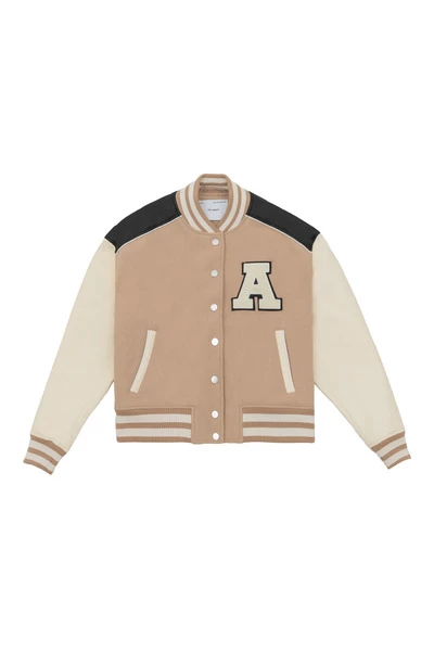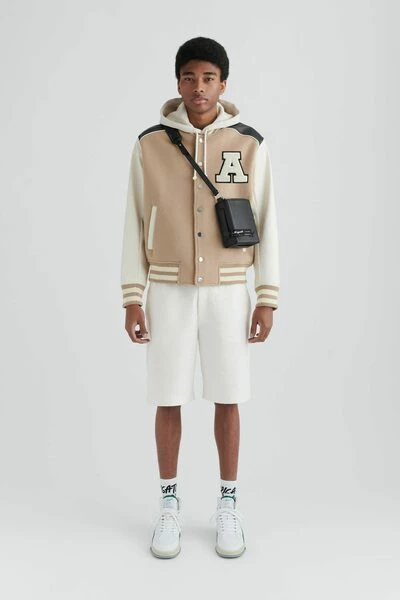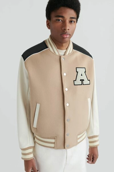 Het klimopjack is geïnspireerd door old-school varsity-stijlen die op de campus worden gedragen. Het paneelprofiel is gemaakt van een combinatie van wol en PU en beschikt over gestreepte geribbelde versieringen aan de kraag, manchetten en zoom. Dit stuk is afgewerkt met een Terry ‘A’ patch. Deze jas wordt regelmatig gesneden.