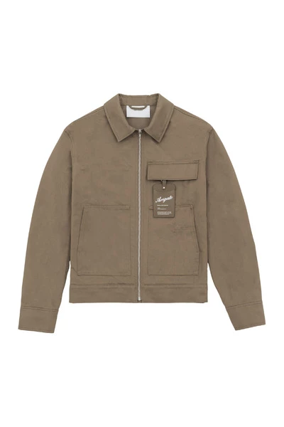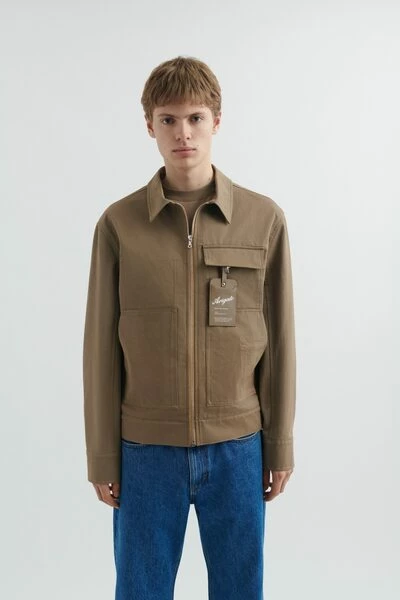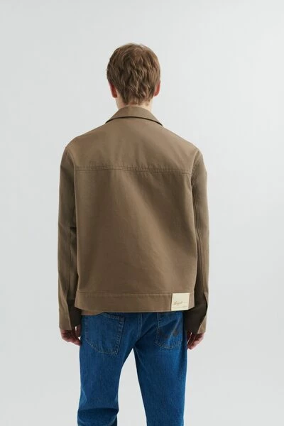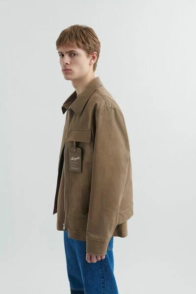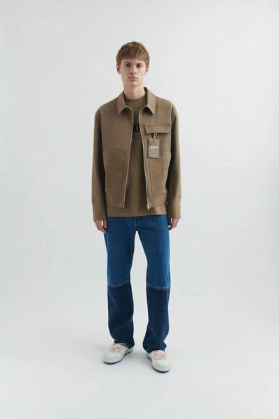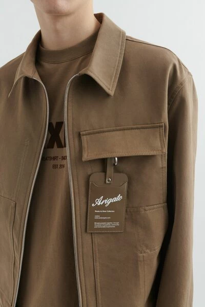 Het verhaaljas leent van klassieke werkkleding, dus het is gesneden uit strak geweven katoen en heeft een boxy collared -profiel. De flapzak aan de borst is geaccentueerd met een lederen bagagelabel. Deze jas wordt regelmatig gesneden.