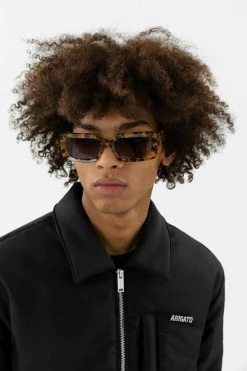 We presenteren de Arena Rectangular-zonnebril vervaardigd met een schildpadpatroon van celoseacetaat. De zonnebril is voorzien van donkerblauwe lenzen met 100% UV-bescherming en een scharnier van hoge kwaliteit dat de voorkant verbindt met de slapen, afgewerkt met gegraveerd Arigato-logo op beide tempels.