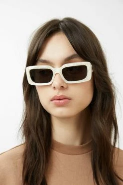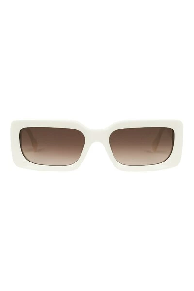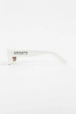 Presentatie van de arena rechthoekige zonnebrillen vervaardigd met ivoorcelluloseacetaat. De zonnebrillen zijn bevatte bruine lenzen met 100% UV -bescherming en een hoogwaardig vatscharnier dat de voorkant verbindt met tempels, afgewerkt met gegraveerd arigato -logo op beide tempels.