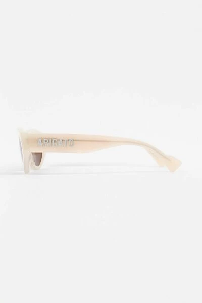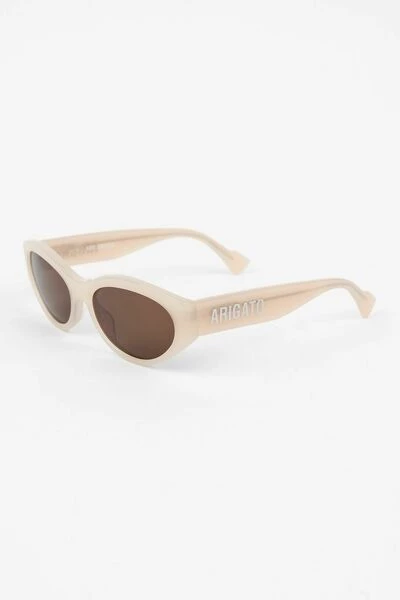 We presenteren de Tonia Cat-Eye-zonnebril gemaakt van melkachtig perzikkleurig celoseacetaat. De zonnebril heeft bruine lenzen met 100% UV-bescherming en een hoogwaardig scharnier dat de voorkant met de tempel verbindt, afgewerkt met gegraveerd Arigato-logo op beide tempels.